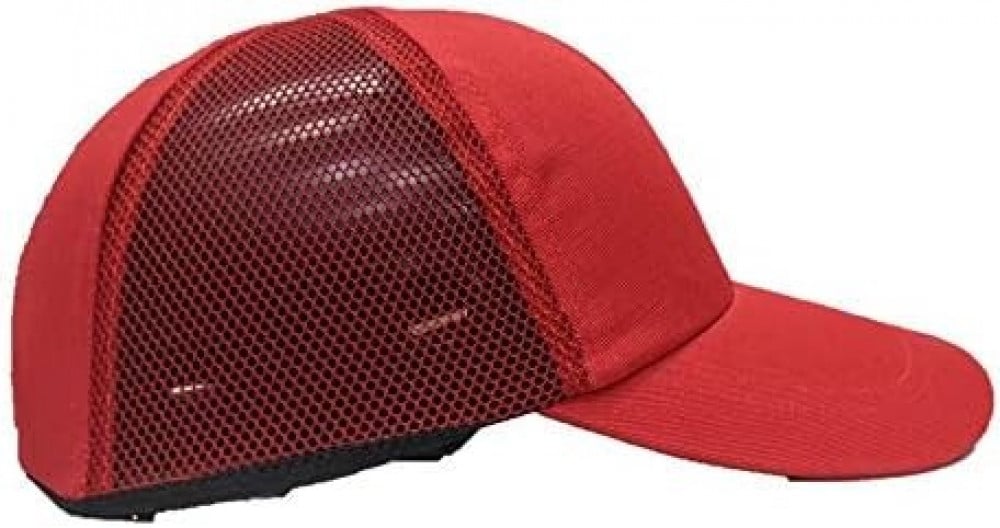 The safety helmet with head protection, has a shock-absorbing cap, and comes in a breathable hard hat design in red.