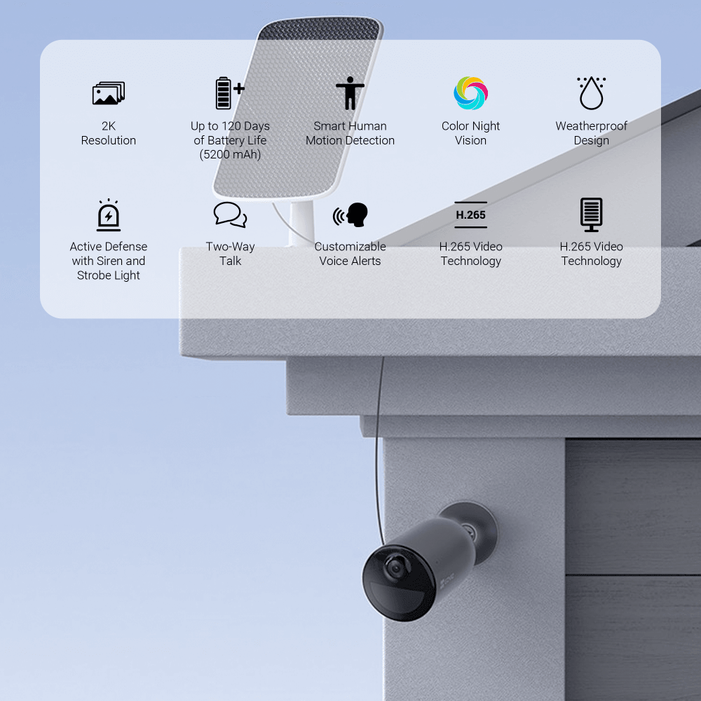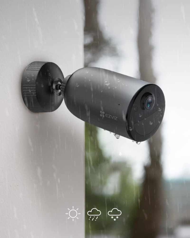 Product Name: EZVIZ EB3, which is an external wire-free CCTV camera with a rechargeable battery. This 2K camera offers Wi-Fi, two-way audio, water resistance, PIR (passive infrared), and intelligent human motion detection.